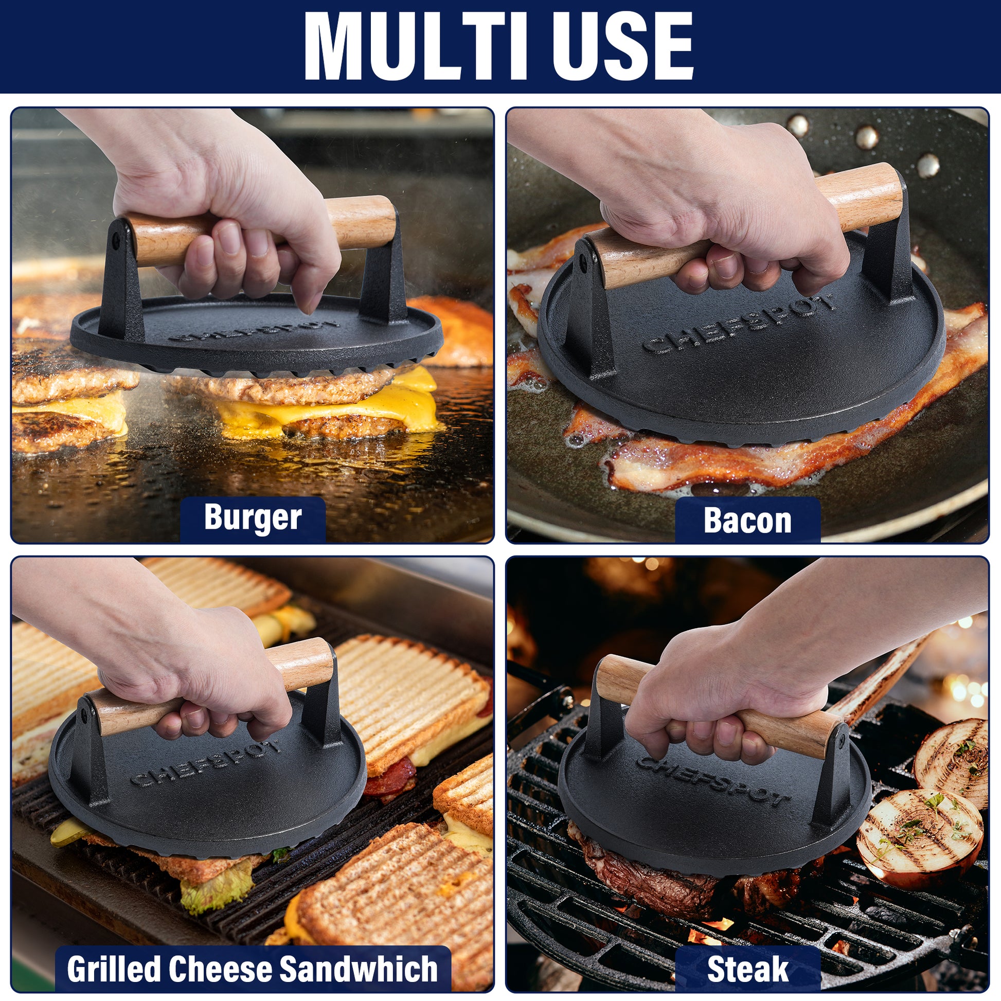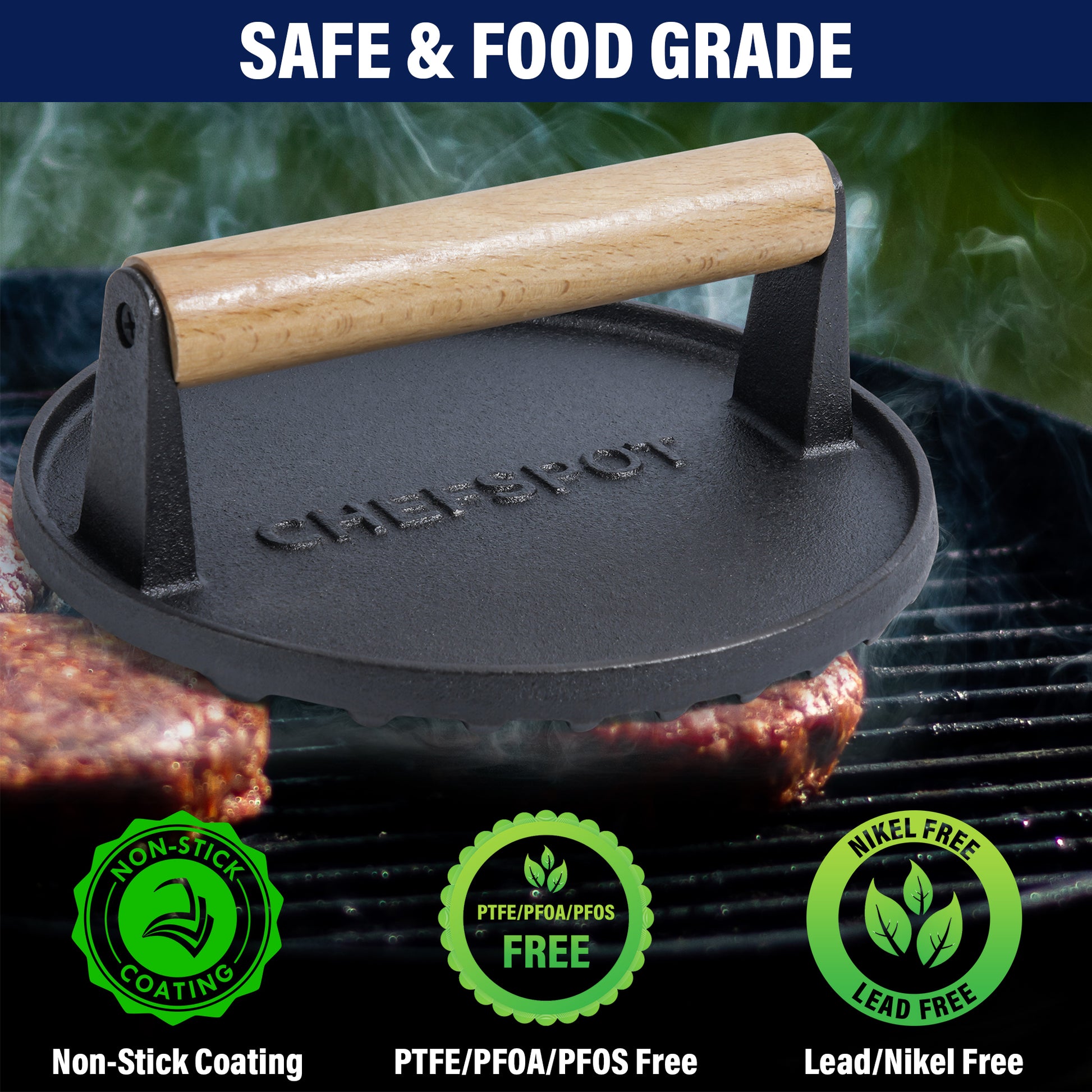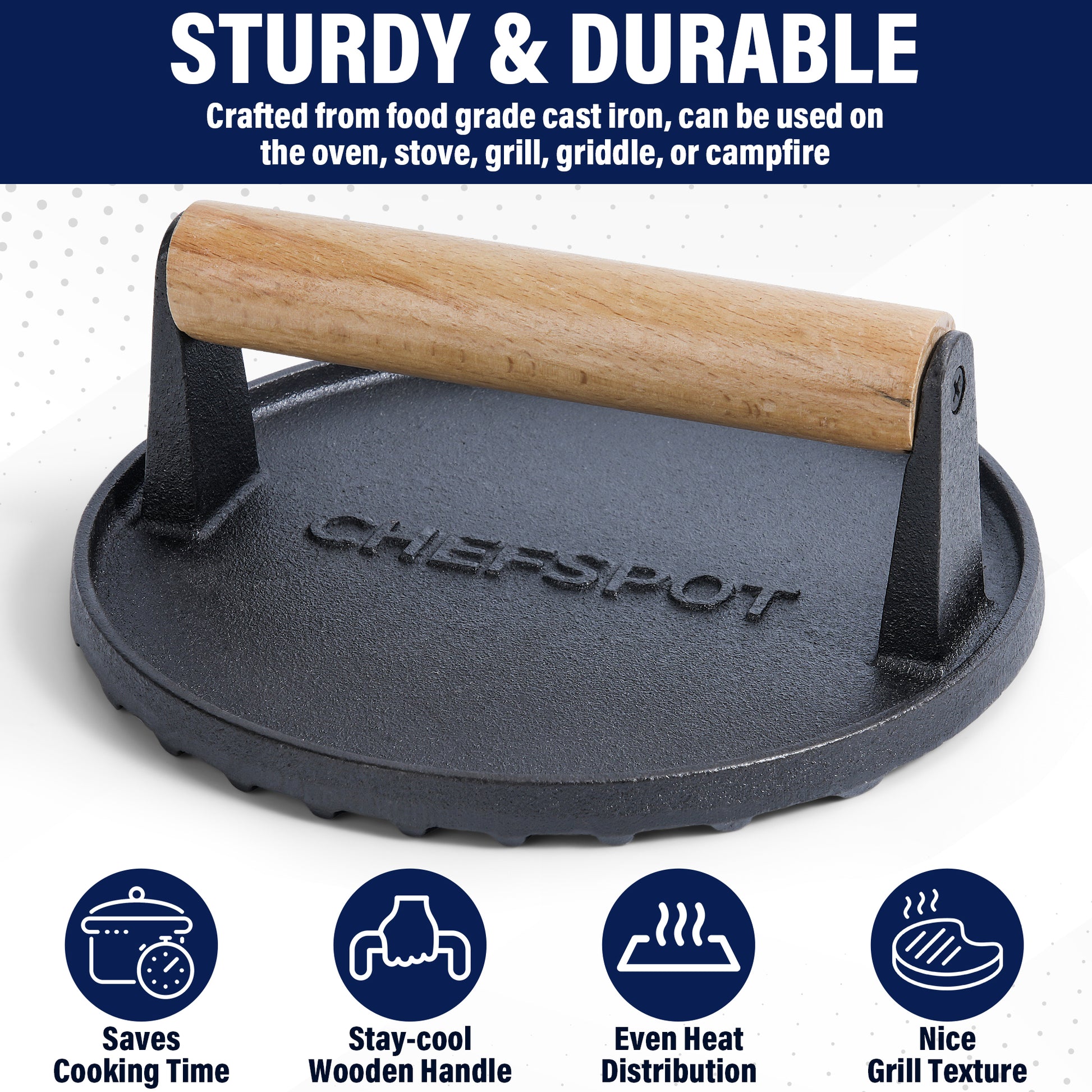 CHEFSPOT Preseasoned Cast Iron Round Burger Press - Rigged Surface - Great for Smash Burgers, Bacon, Steaks and Grill Marks