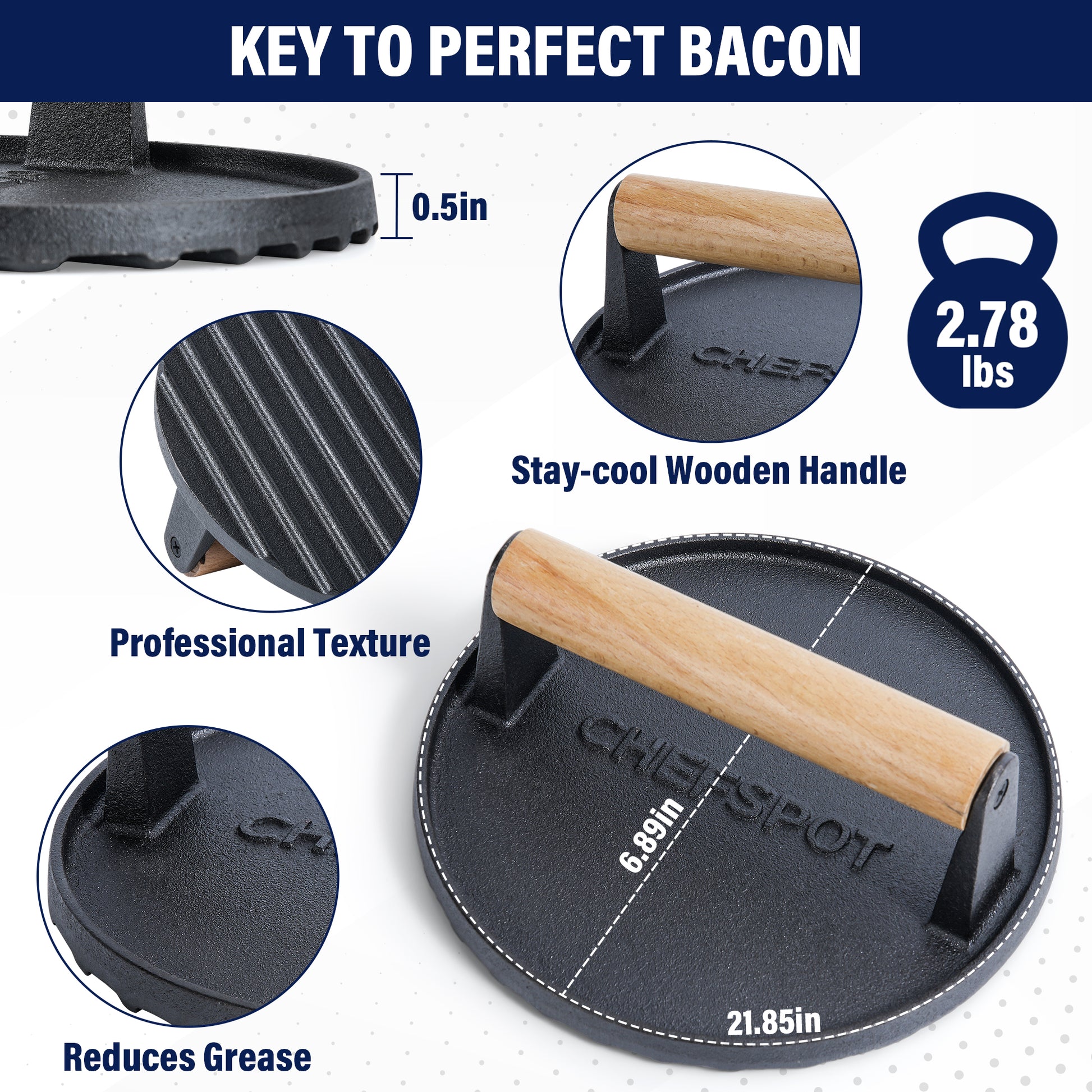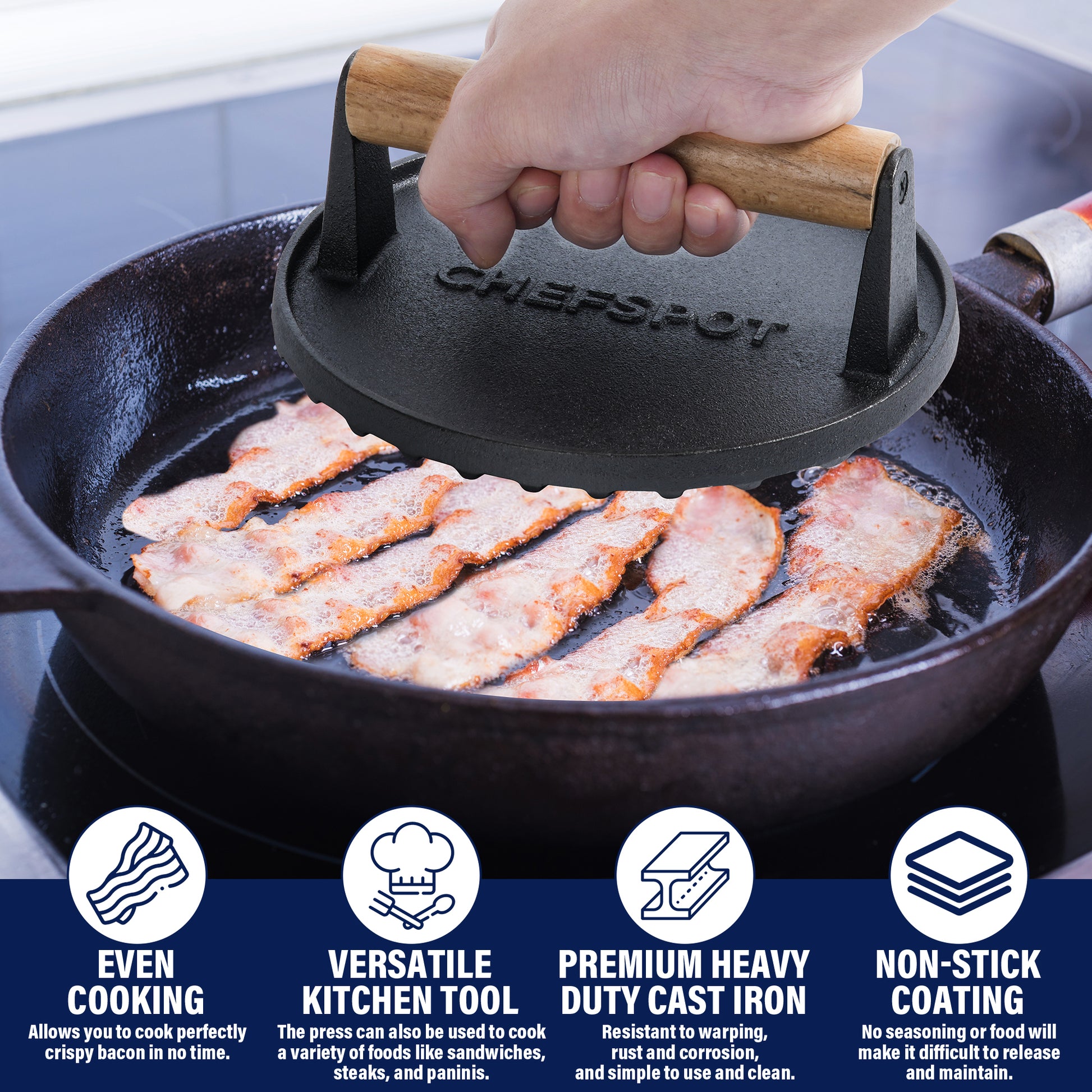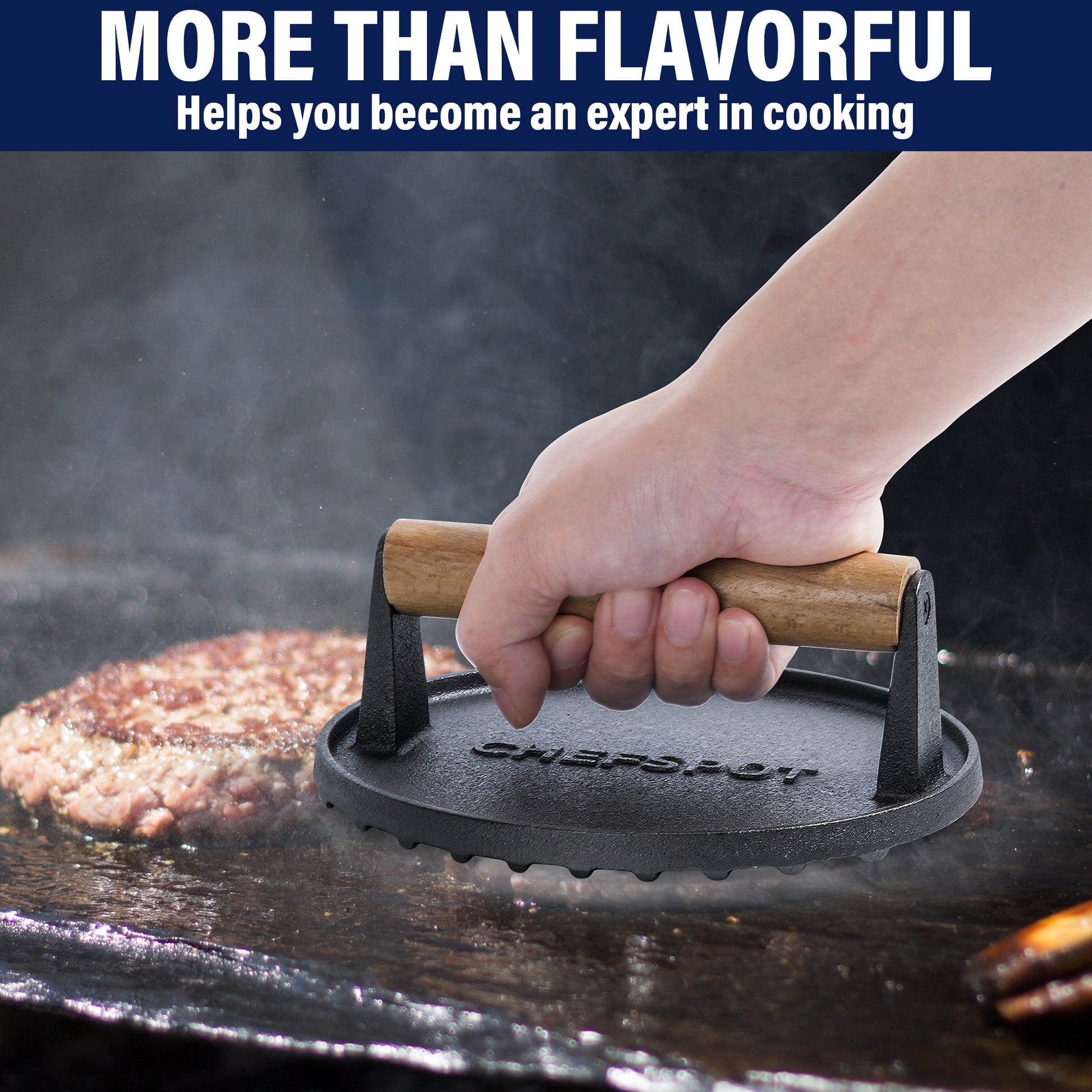 CHEFSPOT Preseasoned Cast Iron Round Burger Press - Rigged Surface - Great for Smash Burgers, Bacon, Steaks and Grill Marks