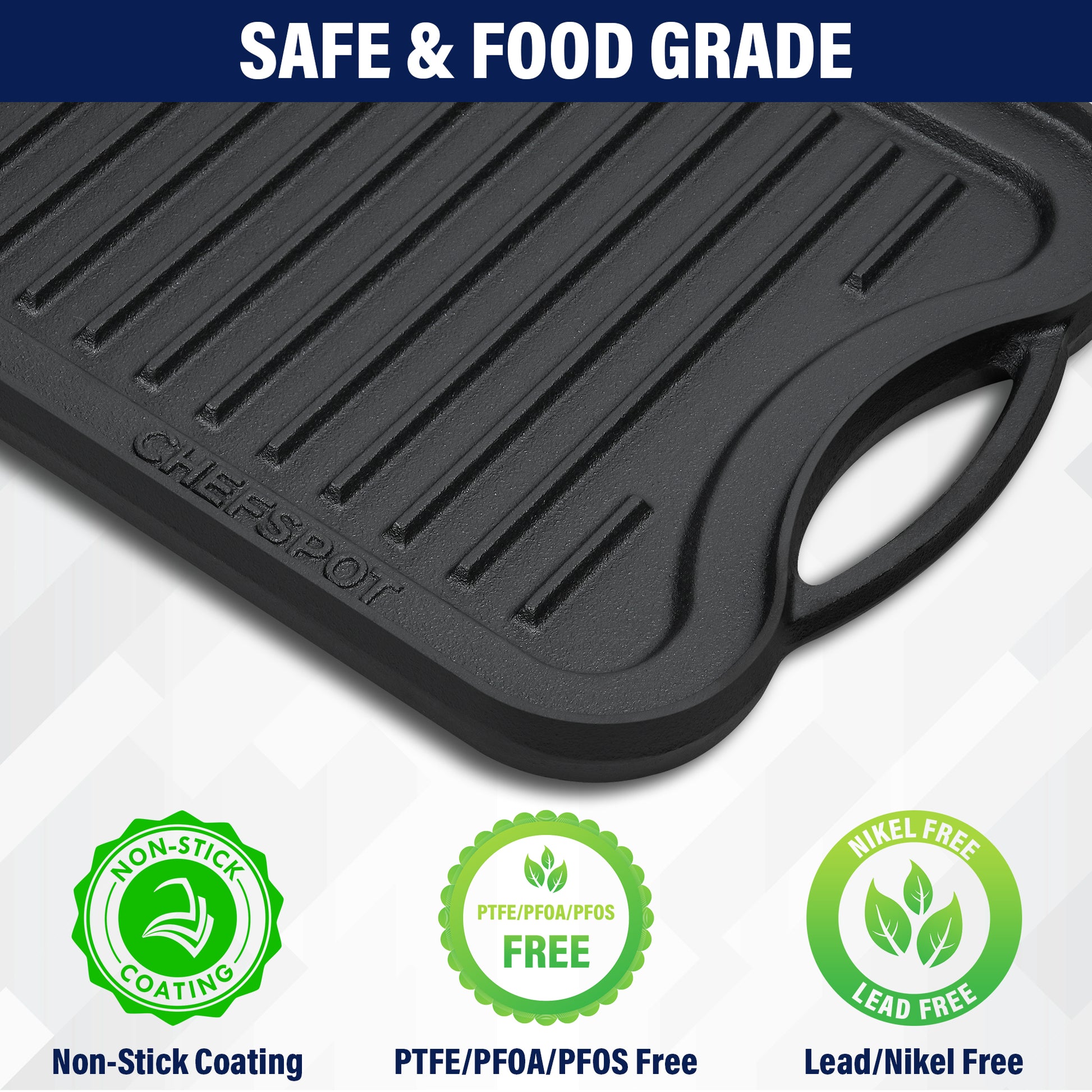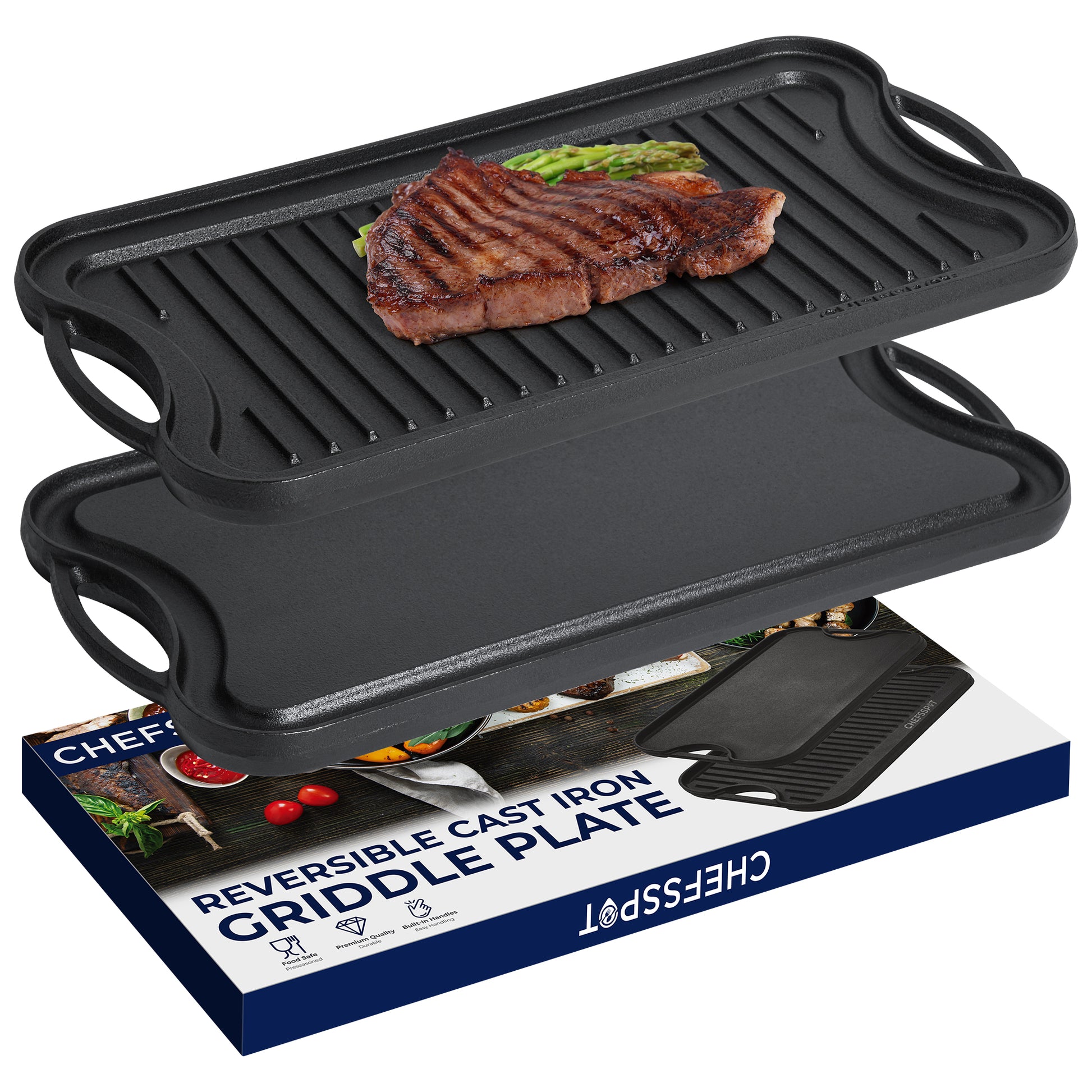 Elevate your culinary prowess with the CHEFSSPOT Reversible Cast Iron, a kitchen essential designed to elevate your cooking experience with consistent, exceptional results. Crafted from high-quality cast iron this double burner griddle boasts a premium finish that not only prevents rust but also provides a natural non-stick quality, ensuring durability through frequent use without compromising on performance. The dual-sided pan eliminates hotspots and uneven cooking, offering even heat distribution for perfectly cooked dishes every time. Whether you're grilling fish or meats on the ribbed side, allowing juices to drain off, or preparing eggs and pancakes on the flat side this stove top griddle delivers versatility in your kitchen. The user-friendly design includes easy-grip handles for a seamless transition from stovetop to dining table and it's compatible with stovetops, ovens and open flames, allowing you to explore various cooking techniques. Cleaning is a breeze with a simple wipe down after each use, ensuring years of reliable performance and making it an indispensable addition to your kitchen arsenal.