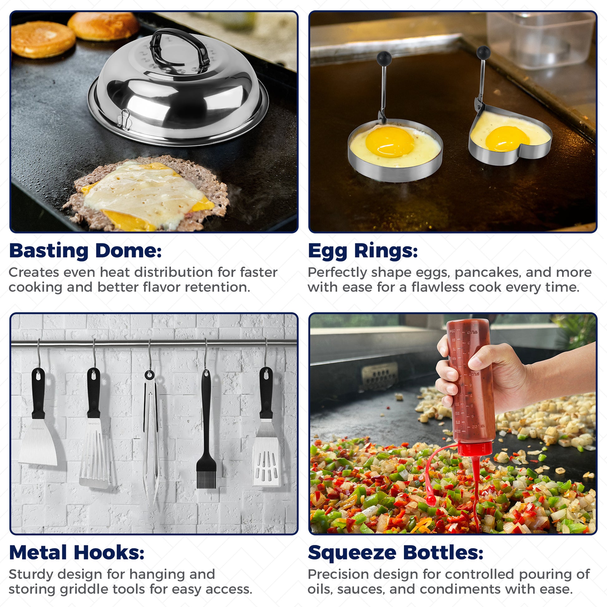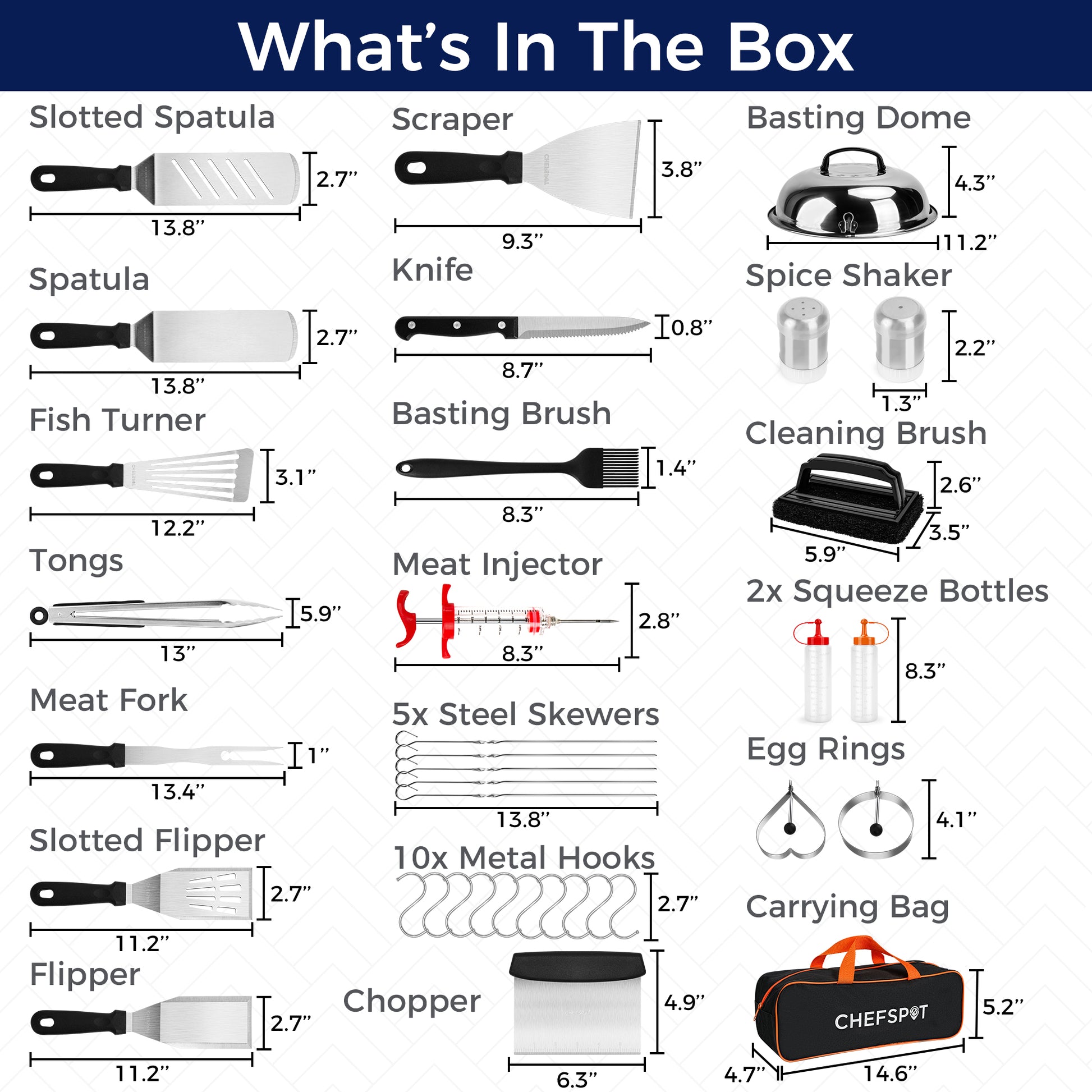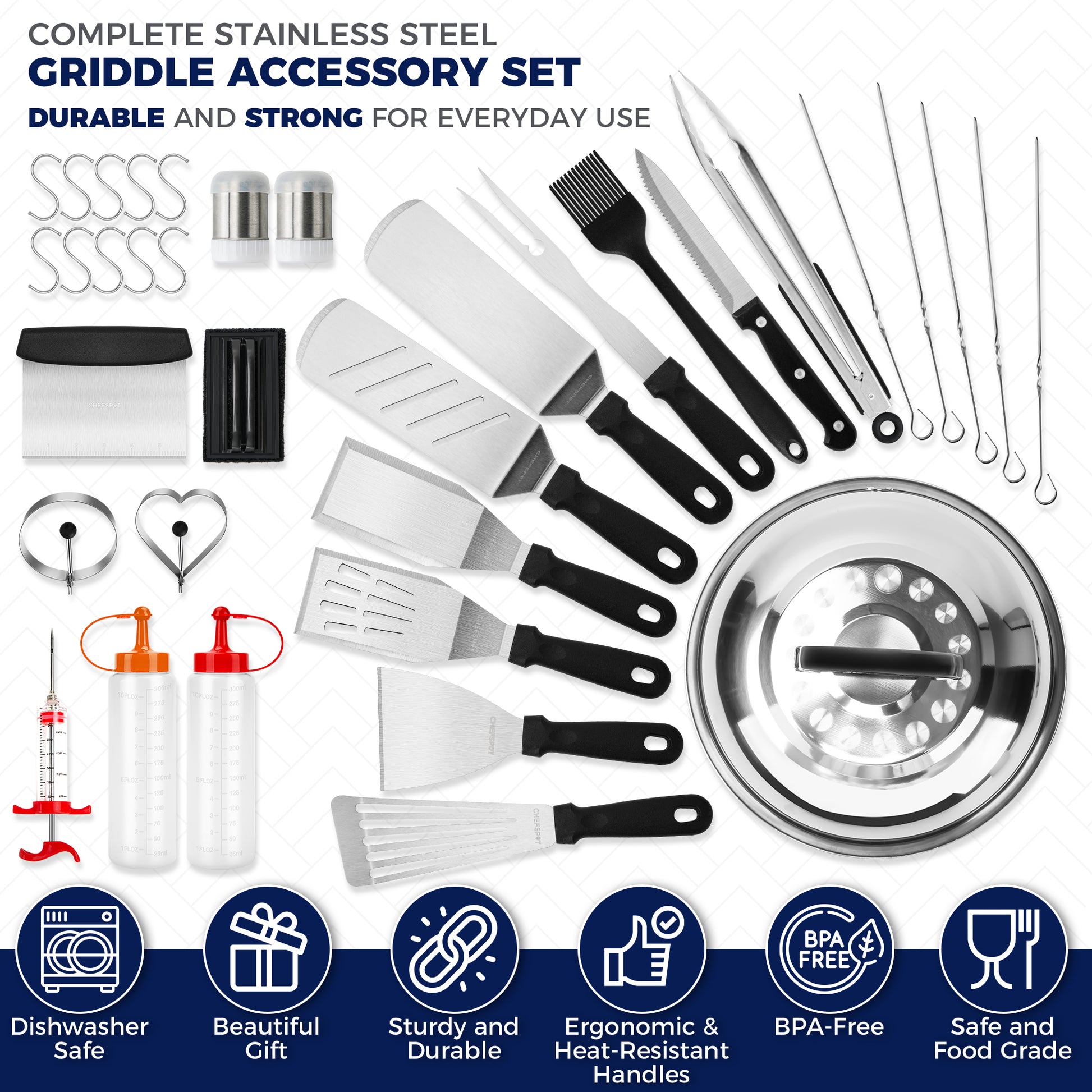 EVERY GRIDDLE TOOL YOU NEED - If you’re looking for a professional-grade accessory tool kit that is easy to clean and worthy to be in your kitchen we got you covered. Our 36 pcs griddle accessory bundle has Spatula, Slotted Spatula, Flipper, Slotted Flipper, Chopper, 12" Tongs, 2 Squeeze Bottles, Fish Turner, Meat Fork, Scraper, Knife, Basting Brush, Meat Injector, Cleaning Brush, 5 Steel Skewers, 10 Metal Hooks, Basting Dome, 2 Spice Shakers, 2 Egg Rings, and 1 Carrying Bag.