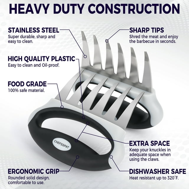 - QUICK AND EFFORTLESS SHREDDING - Say goodbye to the tedious and time-consuming task of pulling apart meat by hand or using forks that can easily bent, because now with the meat handler shredder claws, you can effortlessly shred meat in seconds, saving you valuable time and energy.