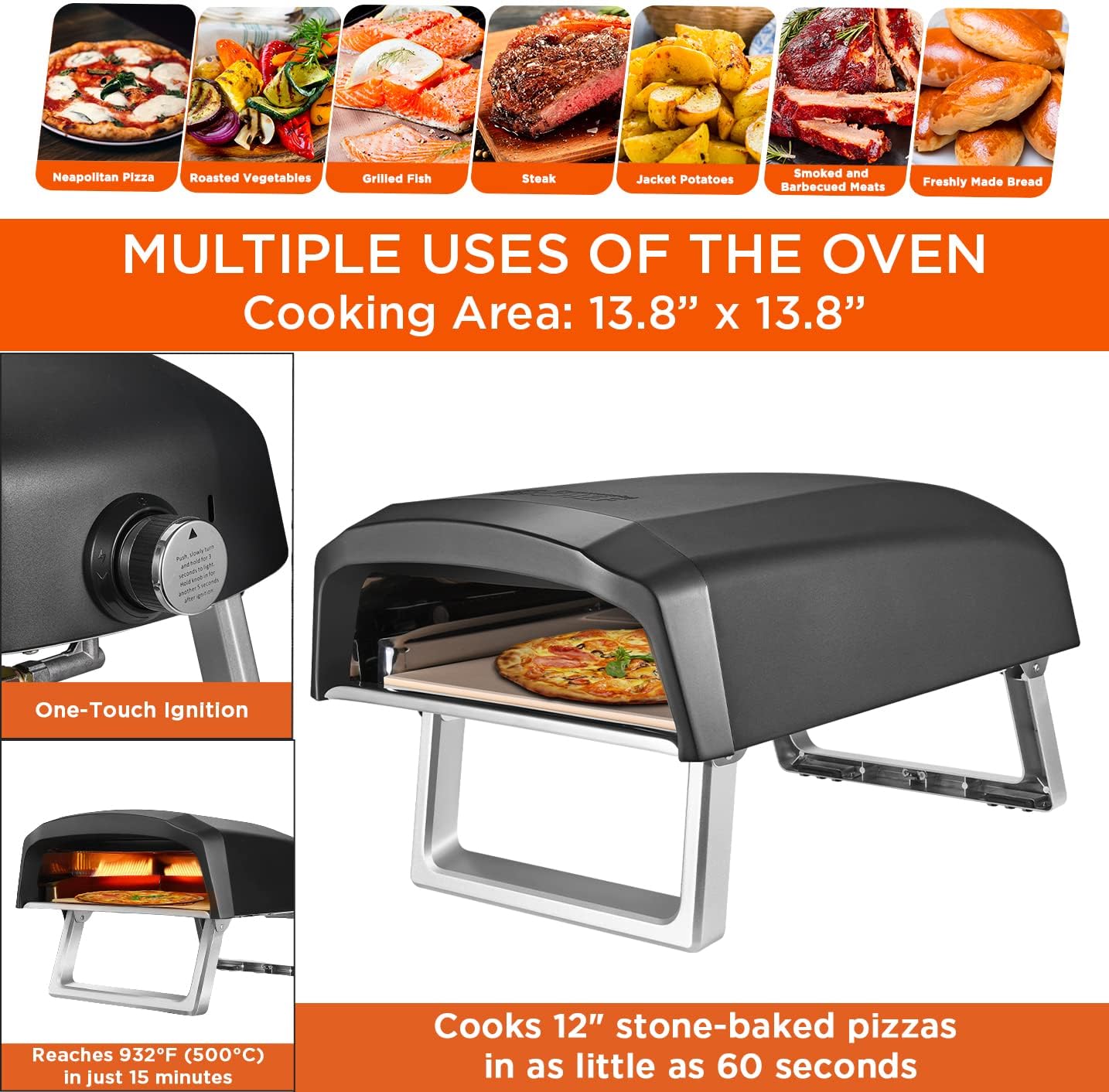 - A LOT OF USES - Aside from your usual Margherita, you’ll now be able to rustle up roasted vegetables, baked or grilled fish, steak, jacket potatoes, smoked and barbecued meats, and even freshly made bread in your portable oven.