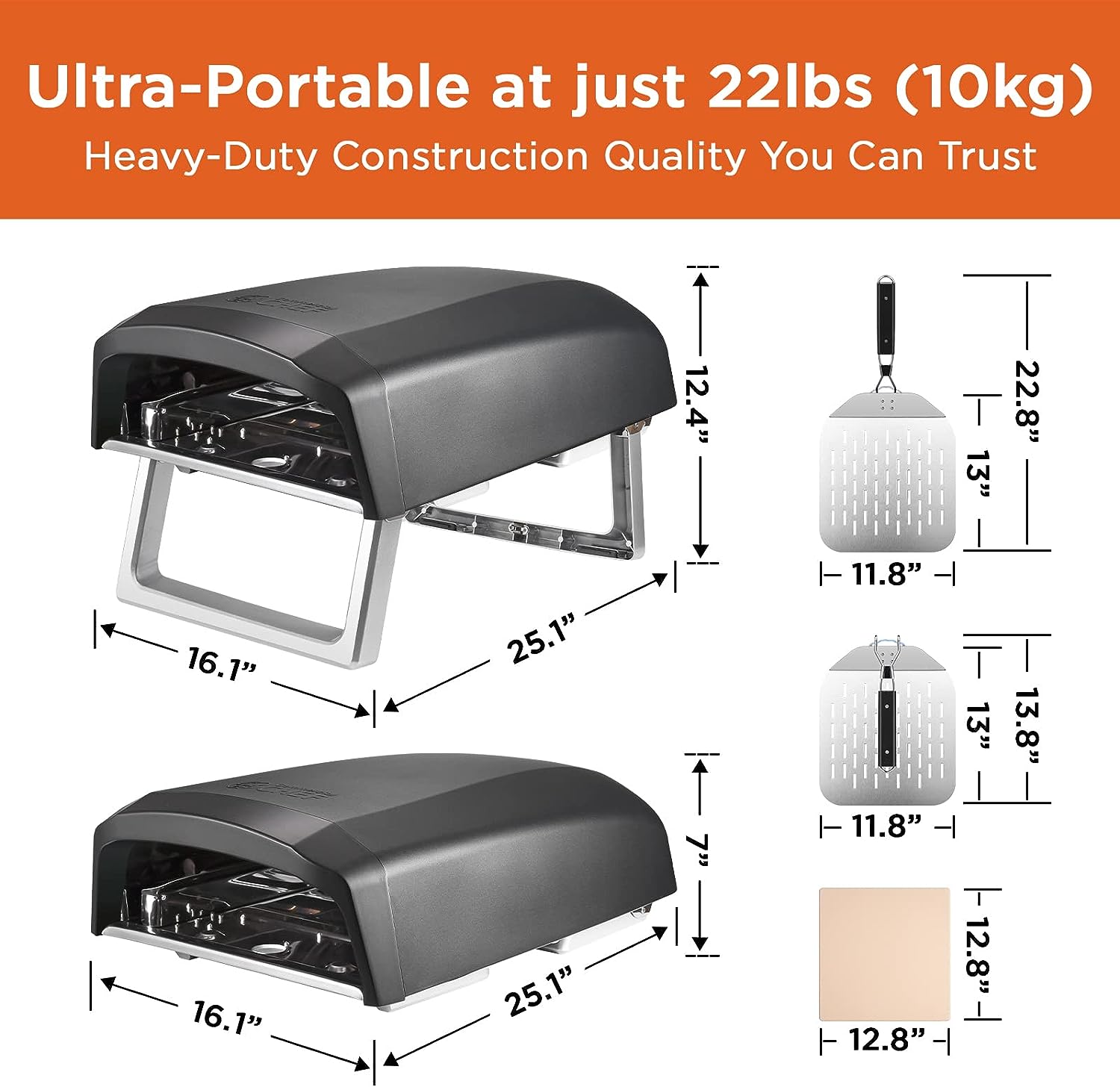 - QUALITY YOU CAN TRUST - Skip the delivery and make pizza anytime you want in this gas powered portable pizza oven. Designed with no chimney, two foldable snap-out legs, and no assembly required which makes it ideal for backyards, countertops, or camping.
