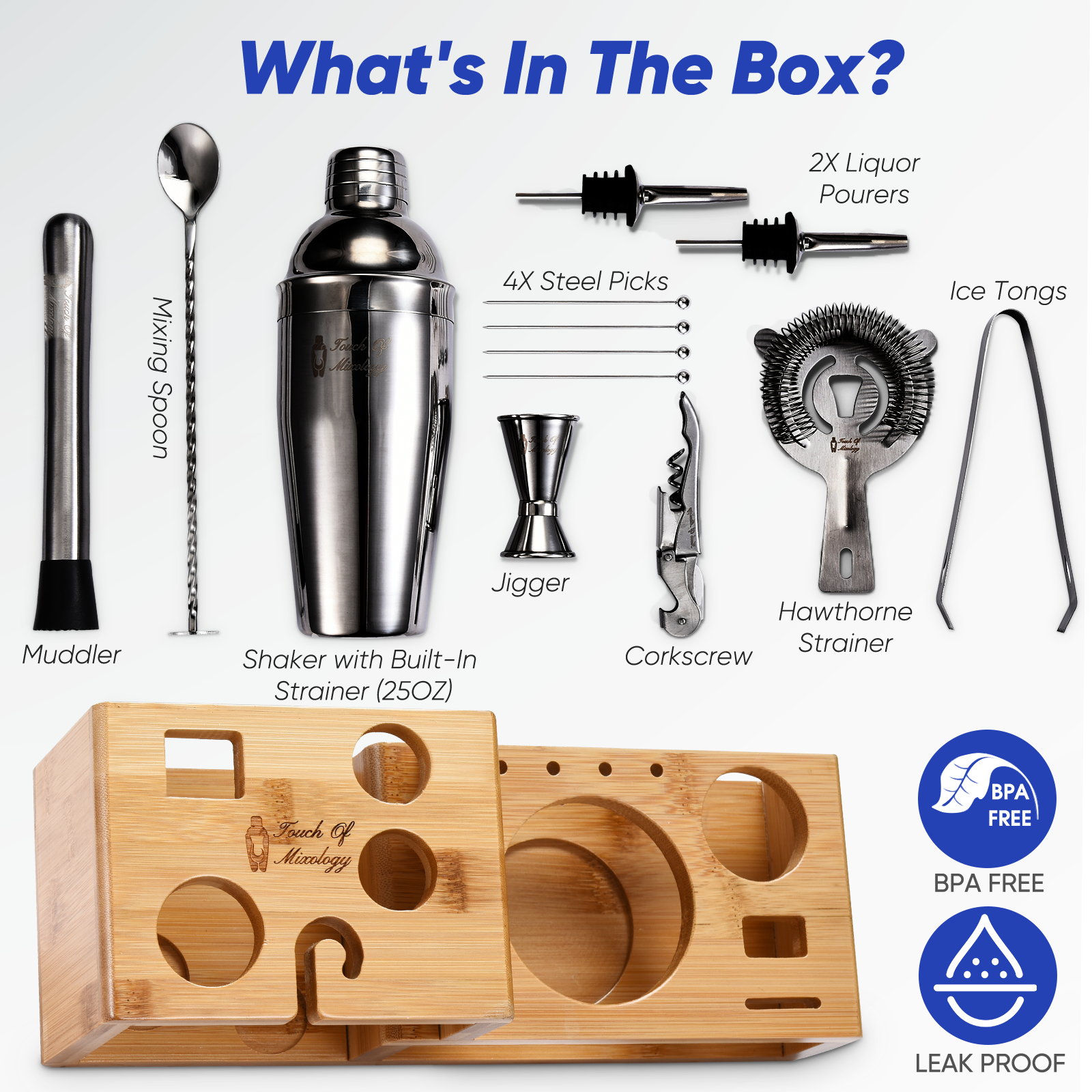 - THE COMPLETE SET – The 14 Piece bar tool set includes Shaker with Built-In Strainer (750ML), 2 Liquor pourers, Strainer, Muddler, Jigger, Corkscrew, Ice Tongs, Mixing Spoon, and 4 Steel Picks, beautifully packed in a elegant and sophisticated bamboo stand where you can store everything until your next use.