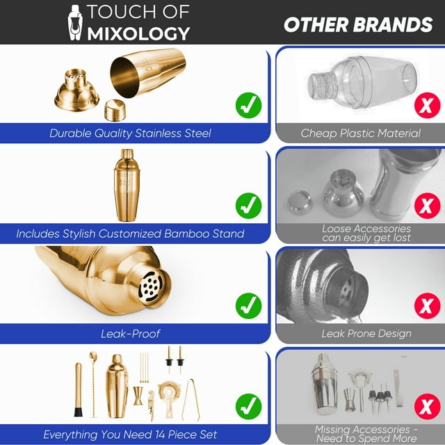 Touch of Mixology 14 Piece Stainless Steel Bartender Kit Includes Cocktail Shaker (Gold)