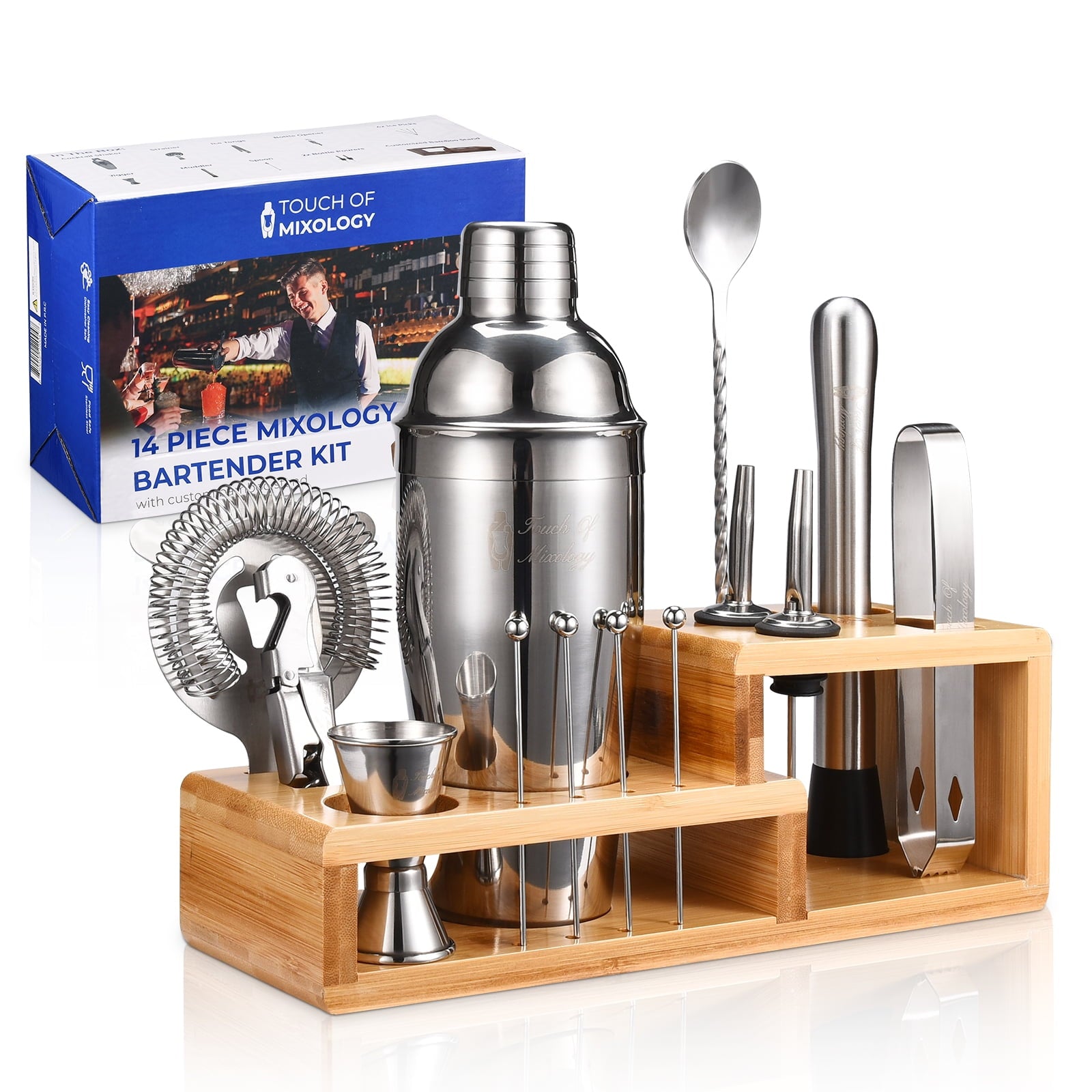 - THE COMPLETE SET – The 14 Piece bar tool set (TMBRTL14) includes Shaker with Built-In Strainer (750ML), 2 Liquor pourers, Strainer, Muddler, Jigger, Corkscrew, Ice Tongs, Mixing Spoon, and 4 Steel Picks, beautifully packed in an elegant and sophisticated bamboo stand where you can store everything until your next use, and proudly display to you home bar.